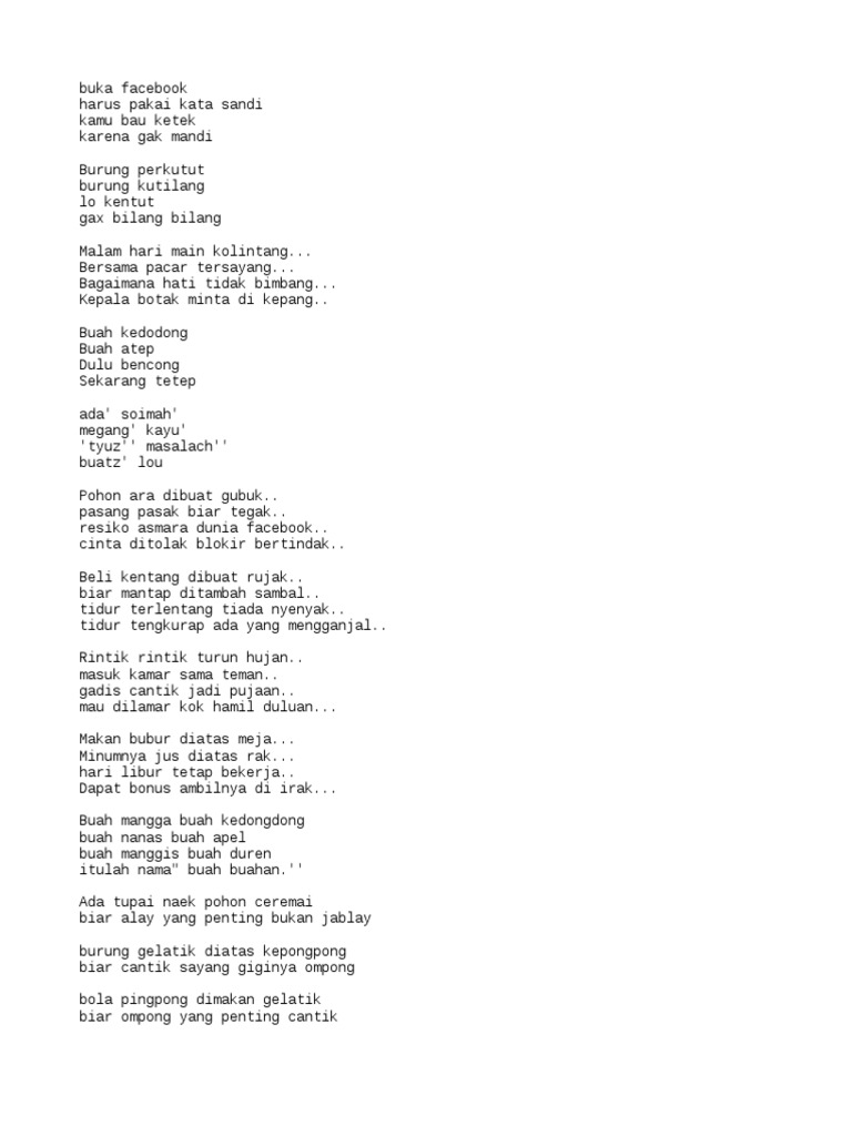 Pantun anak anak lucu banget. Pantun lucu pantun merupakan sebuah naskah fiksi maupun puisi yang biasanya terdiri dari 4 baris dan memiliki makna yang terkandung di dalamnya. Nah itu tadi kumpulan pantun lucu gokil banget yang tentunya bikin ngakak. Agar tidak mengundang rasa tersinggung dan bersama dengan pantun jenaka dapat membuat kondisi akan jadi tambah meneyenangkan.