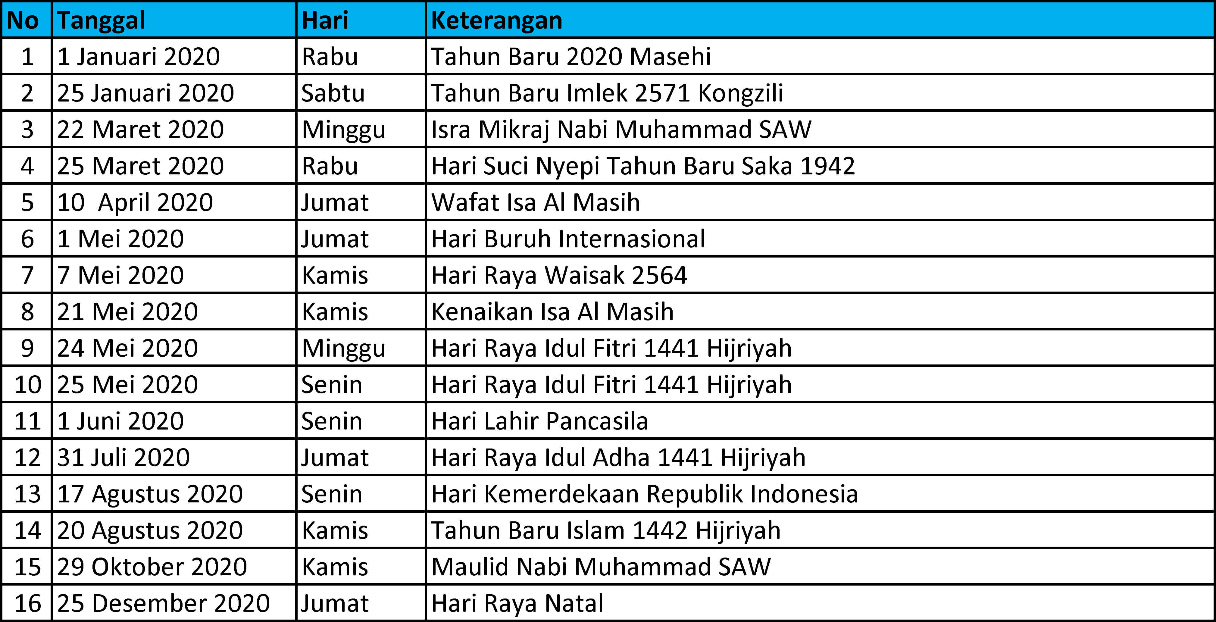 Hari libur nasional 2020 tanggalhari hari raya libur nasional 2020 1 januari 2020 rabutahun baru 2020 tahun baru masehi 2020 25 januari 2020 sabtuhari raya imlek 2020 tahun baru imlek 2020 22 maret 2020 mingguhari raya isra mi raj.