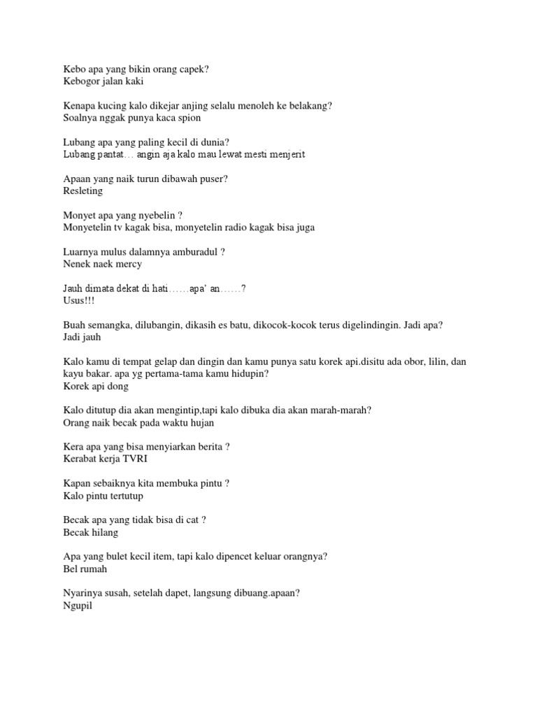 8 soalnya yang 2 lagi maen di kali. Ulet bulu bawa bom. Teka teki bisa dibuat dengan tujuan ingin membuat orang disekeliling kita tetap bahagia tersenyum dan nyaman dengan adanya kehadiran kita tujuan lainnya yaitu untuk untuk menguji seberapa pintar otak kita t.