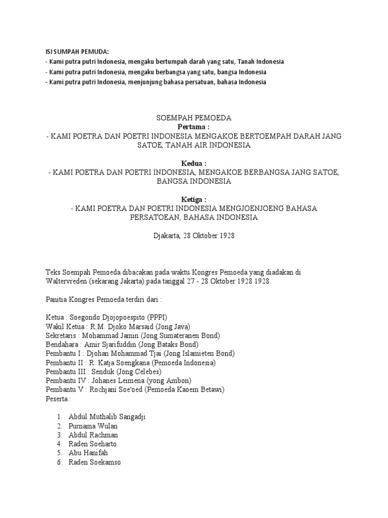 Isi sumpah pemuda tanggal 28 oktober 1928 adalah sebagai berikut. Forum ini dipimpin oleh sugondo joyopuspito pppi dan joko marsaid jong java. Sejarah sumpah pemuda pada 28 oktober 1928 mengandung isi dan.