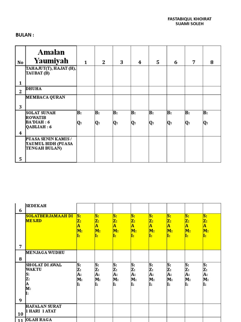 Salah satu amal yaumiyah yang dilakukan rasulullah shallallahu alaihi wasallam. Amalan dari rasulullah datang ketika ada seorang sahabat menghadap rasulullah saw. Mutabaah yaumiyah terdiri dari aspek sholat berjamaah sholat dhuha sholat tahajud sholat sunnah rawatib puasa sunnah dzikir hafalan hadist dan menambah kosa kata bahasa asing.