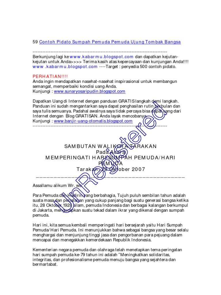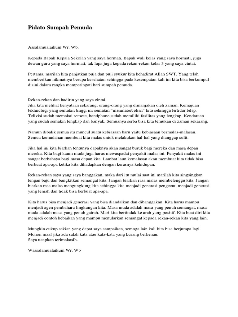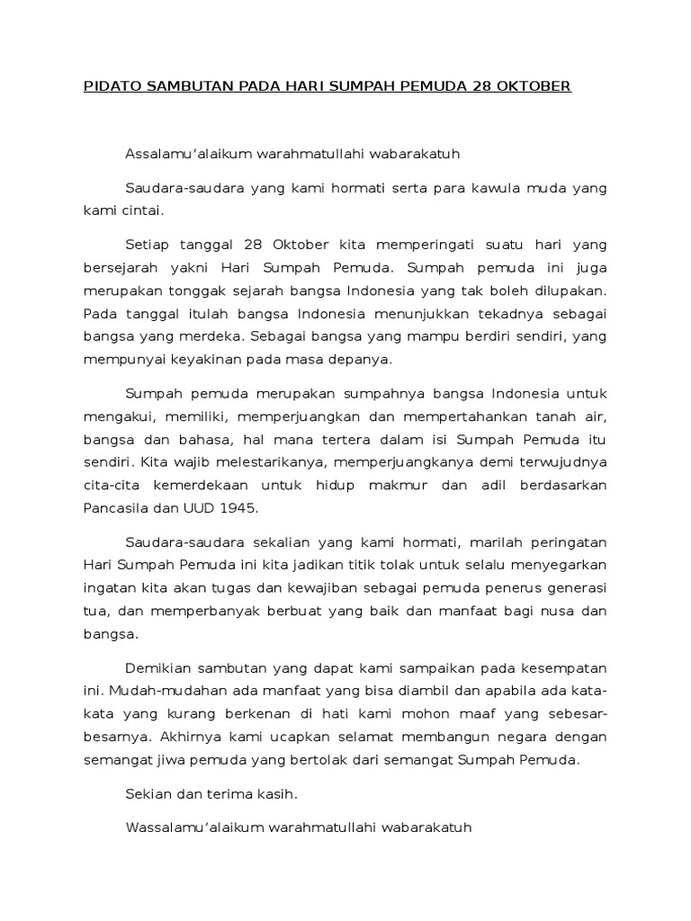Teks pidato tentang hari sumpah pemuda. Biasanya pidato ini akan disampaikan pada hari sumpah pemuda yaitu pada tanggal 28 oktober. Untuk itu perlu diketahui tujuan penyampaian terlebih dahulu. Pidato sumpah pemuda pidato sumpah pemuda sangat cocok ditujukan kepada anak muda indonesia.