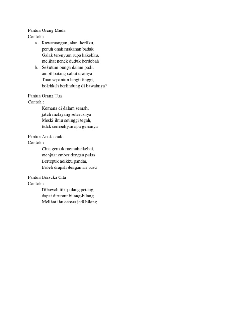 Sesuai apa yang telah disampaikan di awal setelah mengetahui apa itu pantun ciri cirinya jenis jenisnya beberapa contohnya juga sangat penting untuk kamu ketahui.