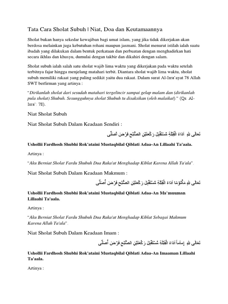 Arti bacaan sholat yaitu untuk bacaan niat sholat subur berarti aku niat salat fardhu shubuh dua raka at menghadap kiblat tepat waktu karena allah ta ala dan secara lengkap akan dijelaskan dalam artikel ini. Dasar perintah sholat di terangkan dalam q s an nisa ayat 103. Keajaiban sholat subuh berjamaah mungkin selama ini sering kita dengar tapi karena alasan ngantuk akhirnya kita malas bangun dan subuh pun kesiangan kalau sholat.