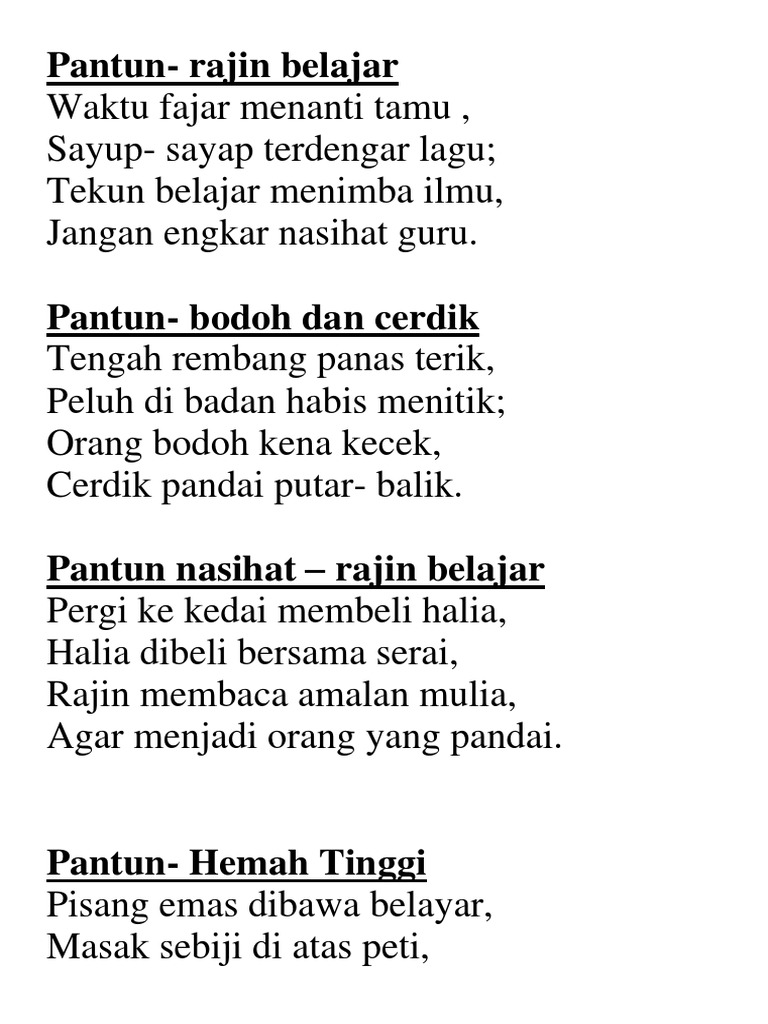 Pantun nasehat nasehat ialah sesuatu tentang teguran petunjuk ajaran anjuran dan pelajaran yang bertujuan untuk suatu kebaikan.