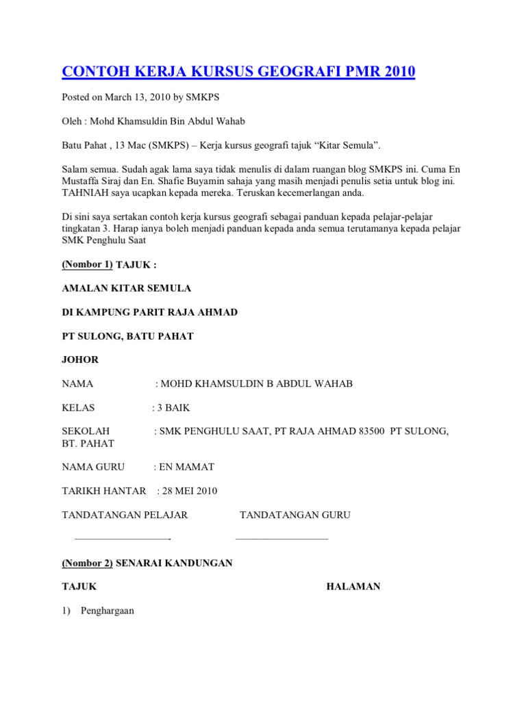 Contoh jawapan kerja kursus geografi pt3 2020. Kawasan ini terletak kira kira 7 kilometer berdekatan dengan. Kitar semula bermaksud mengumpulkan dan memproses semula barang barang terpakai dan terbuang untuk dijadikan barangan baru yang berguna.